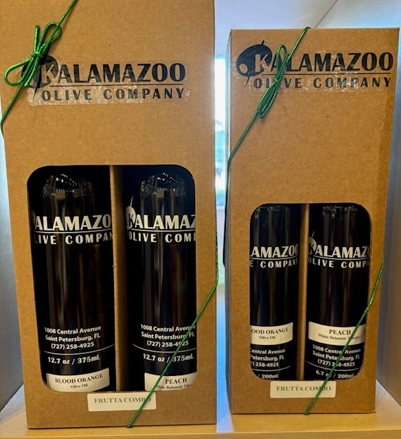 The Frutta Combo features Blood Orange Olive Oil and Peach Balsamic Vinegar, boxed together for easy gifting.